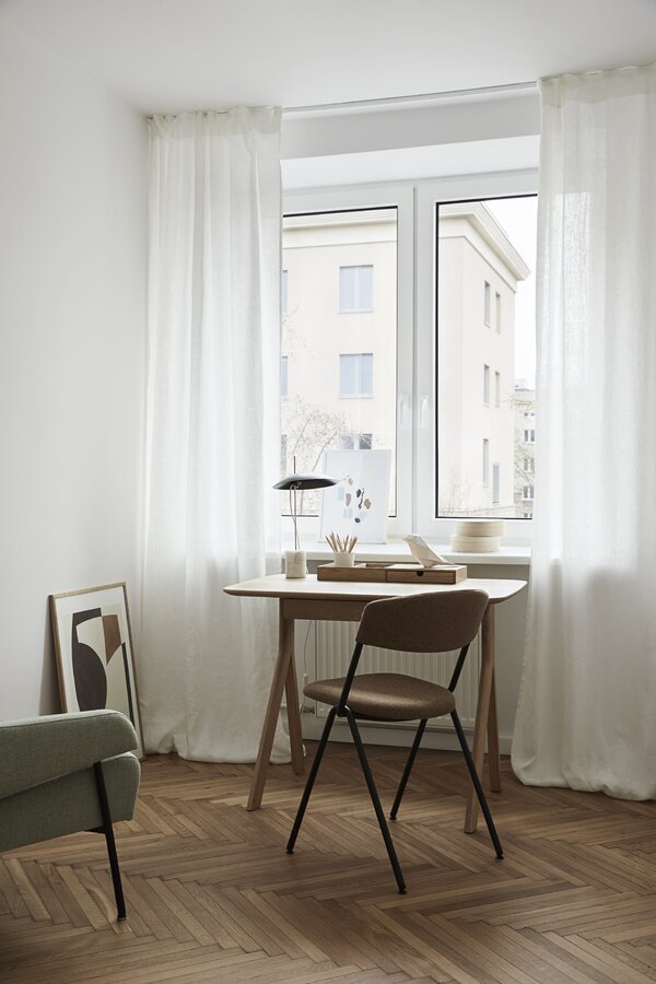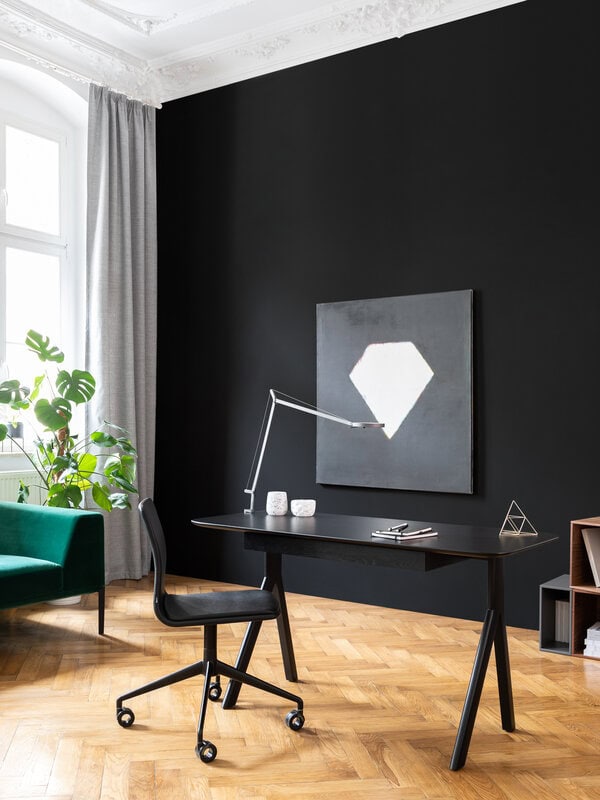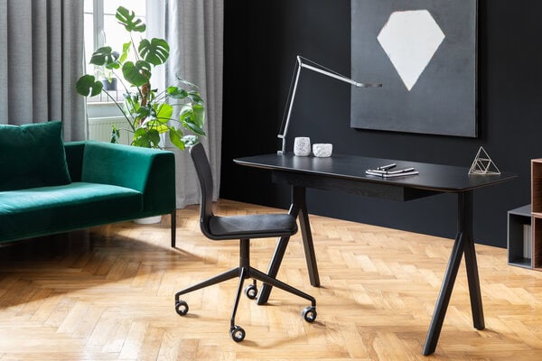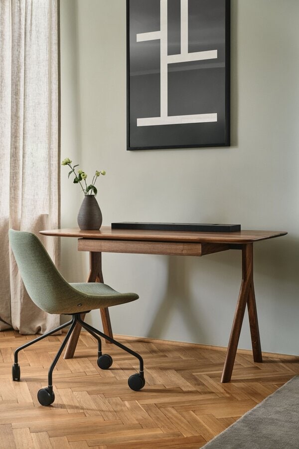 Additional elements enhance the individual character of the constituent pieces. The desk, featuring a handy drawer for all bits and bobs, is the simplest element of the family. The secretary desk is equipped with additional office accessory boxes, and hidden mediaport. The dressing table comes with an adjustable mirror and an additional drawer and storage compartments on the table top.